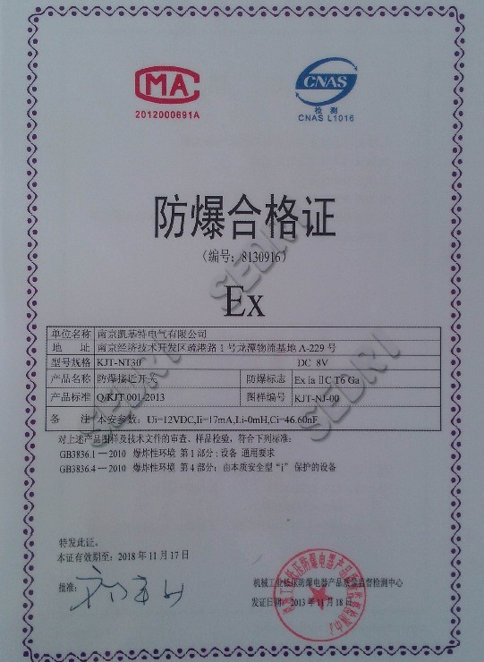 2013年11月18日,我公司生產(chǎn)的本安型接近開關(guān)(防爆接近開關(guān))取得了由國家防爆電氣產(chǎn)品質(zhì)量監(jiān)督檢驗(yàn)中心開具的防爆證(證書編號:8130916 ),在此過程中公司按相關(guān)要求改善了部分生產(chǎn)工藝,對產(chǎn)品技術(shù)細(xì)節(jié)進(jìn)行完善,保證了出廠產(chǎn)品的國家防爆要求。